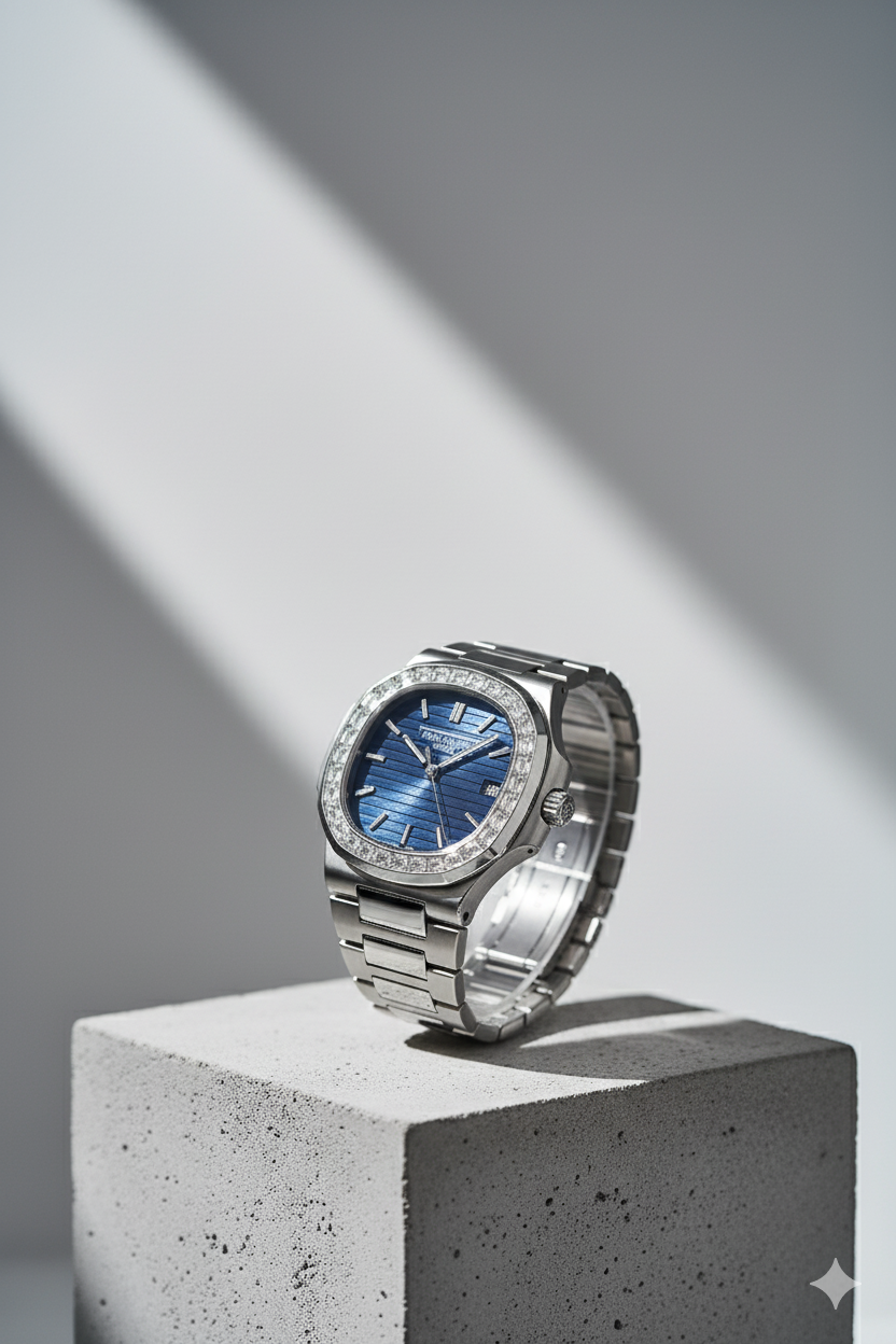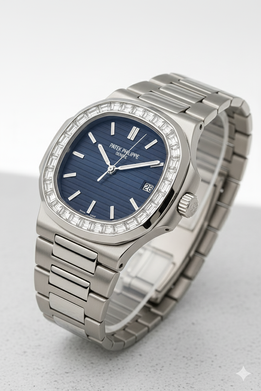Encircling the dial is a diamond-set bezel with baguette-cut stones, giving the watch a subtle yet unmistakable aura of luxury. The dial also includes a date display at the 3 o’clock position, maintaining symmetry and practicality.